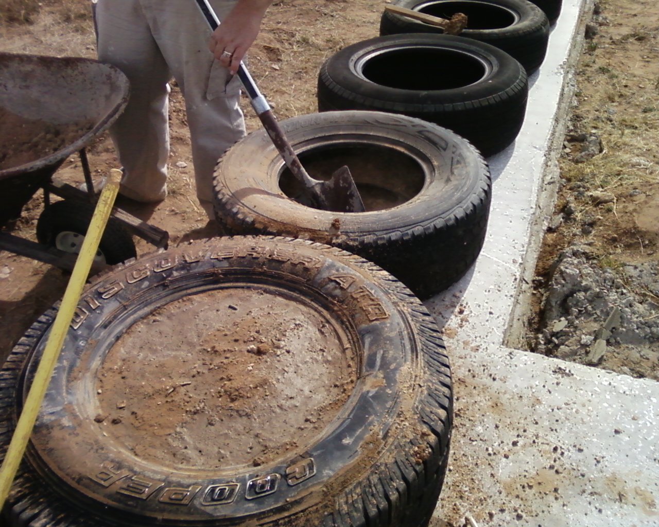 Sometimes you have to "finesse" the rocks out of the dirt. So we rented a Jackhammer (aaarrr) and used it here to get deeper to accomodate plumbing into the house under the Tire Wall Foundation... and also in the septic line that had some stubborn stone that refuse to be budged by the spade. I couldn't lift the thing, but Joe was fairly handy with it. A jackhammer will make much shorter work of rock in the way.
